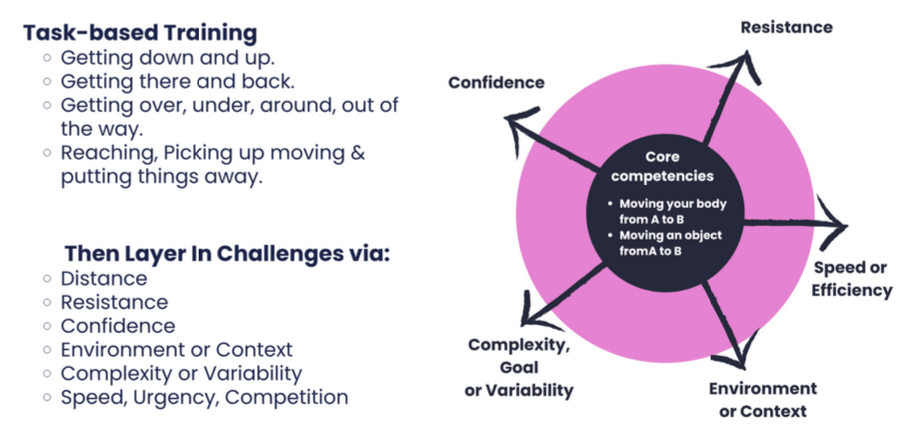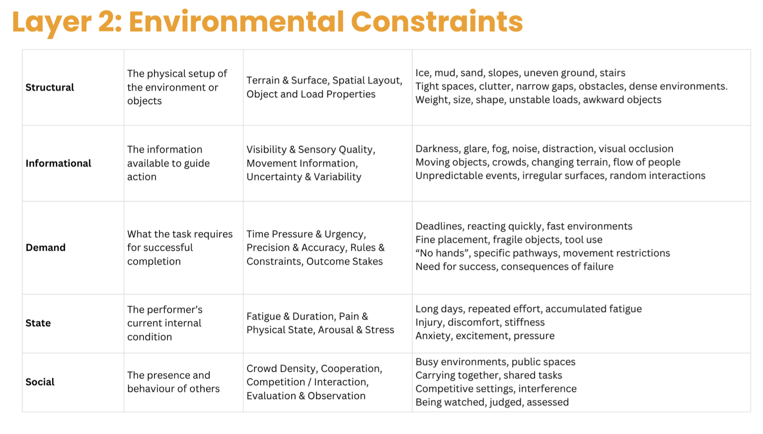 As we tried to map out the course, we realised that we needed to expand on our early task-based model and we started to create a 3 layered framework of task families, environmental constraints, and individual capacities. While this is largely based on Newell’s model, we needed to create a framework that was useful for practitioners to quickly design and evaluate task-based training programmes.