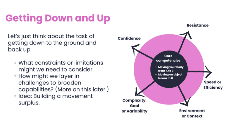 When we started developing Nature Moves, we began to incorporate more ecological design principles, especially task design and emergent coaching principles. We found that a lot of the prescriptive assumptions in the fitness industry weren’t very useful outside of gyms and that the prescriptive style of coaching was usually inappropriate for older adults trying to maintain and build real-life capabilities.
